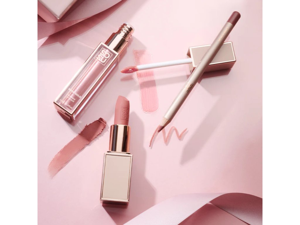 Tato dárková sada obsahuje matnou rtěnku Birthday Suit Matte Lipstick - sytě tónovaná teplá béžová, rtěnku Rose Gold Shimmer Lipglaze - průzračně růžový lesk a rtěnku Cinnamon Lipliner - nude béžová.