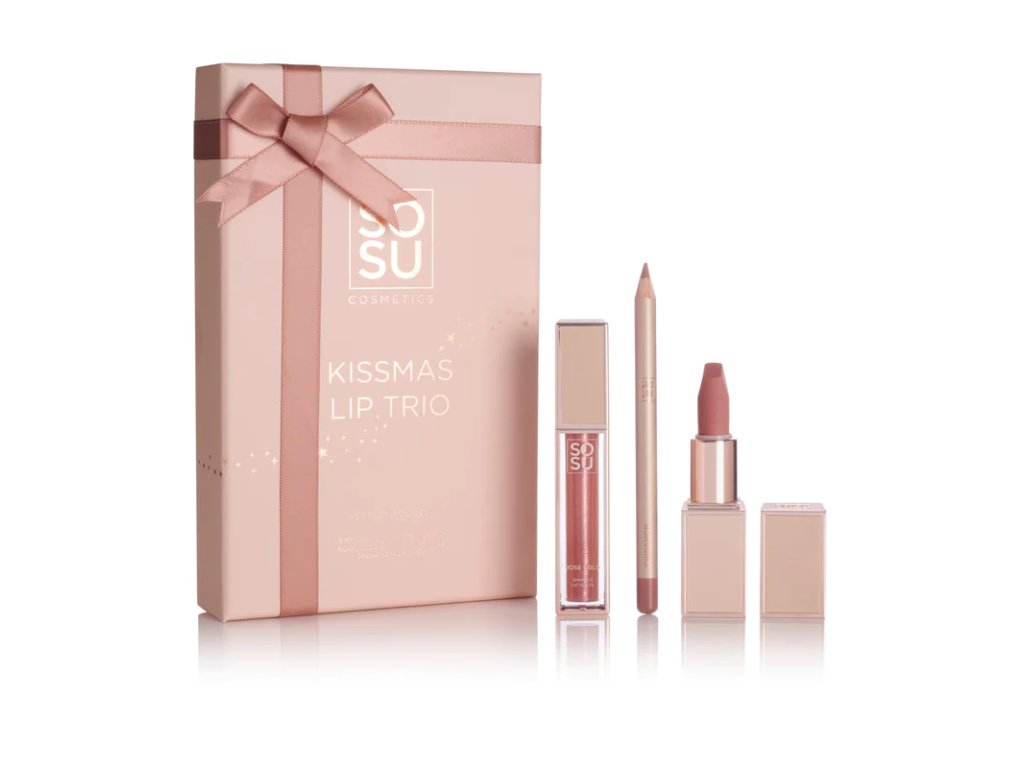 Dosáhněte dokonalého vánočního líčení s naším vánočním triem rtěnek, které obsahuje naši nejprodávanější rtěnku Birthday Suit, novou rtěnku Rose Gold Lipglaze a skořicovou rtěnku.