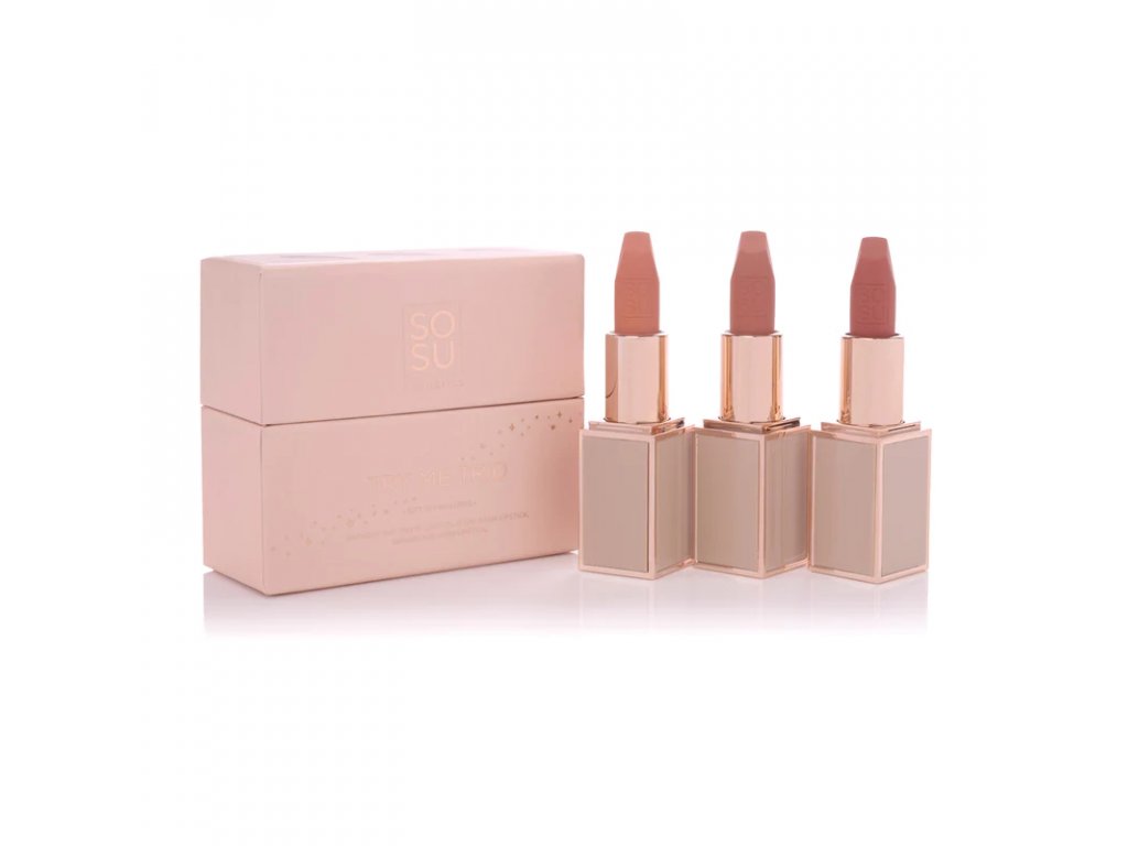 Trio Try Me. Tato úžasná vánoční dárková sada obsahuje dvě různé povrchové úpravy ve třech úžasných nude odstínech, které jsou ideální pro každé líčení. Sada obsahuje naši nejprodávanější matnou rtěnku Birthday Suit, neutrálně růžový odstín. Dále obsahuje dva zbrusu nové odstíny Sugarcane a It Gal s úžasným saténovým povrchem, který udrží vaše rty hydratované po celý den.